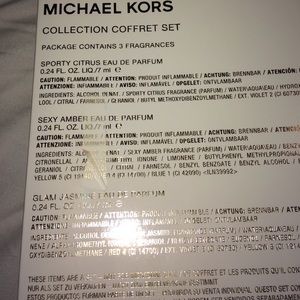 These is a never used Michael Kors collection coffret set containing 3 fragrances. Fragrances are 1. Sporty Citrus 2. Sexy Amber 3. Glam Jasmine