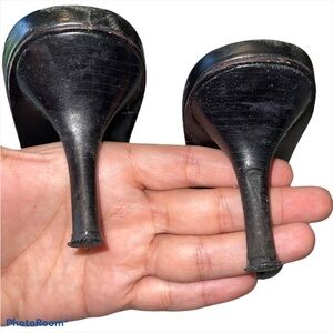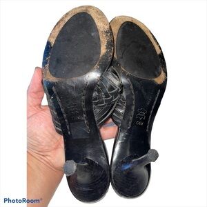 Good condition Michael Kors black leather heels Features: Black thong kitten heels with gold accent. The gold accent shows wear & heel. Please see last two pictures Size 7.5