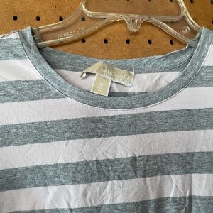 Michael Kors t-shirt with pink and gray stripes. Crew neck collar, zipper detail on sleeves, and ruching on the sides at the bottom. Comfy, soft material