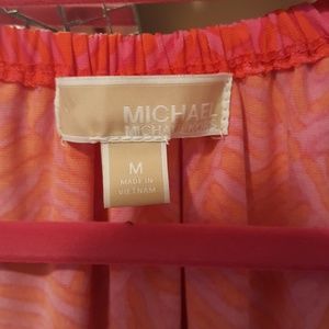 Tangerine and hot pink graphic print. Chain tie neck. Elastic wrist blousy sleeve