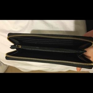 This chic, light, and gold zipper wallet goes with anything, and carries an unexpected amount of items! On the Inside the wallet carries: multiple card slots, bill slots, clear ID holder; and zip compartment. Feel free to let me know if you have any questions / would like more pictures!