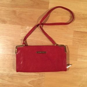 Authentic Michael Kors red wallet on a string. Very unique with worn leather; made to look vintage. Some imperfections. Interior included middle zipper pocket and 6 credit card slots.