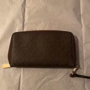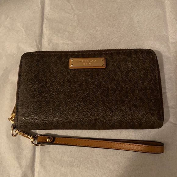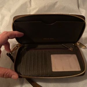 Brown Michael Kors, wallet wristlet, used four times in excellent condition. Proof of authenticity # in picture