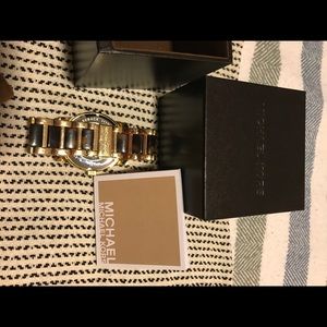 Beautiful tortoise Michael Kors watch. A little chip on the top of the watch, but can get it replaced at the MK store or your local watch shop. Overall, gorgeous watch and never worn anymore. Comes with original box and MK booklet