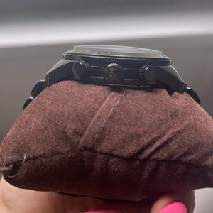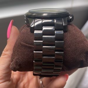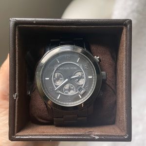 Gun metal silver, comes with box and tag. Face of watch is gray.