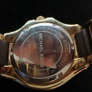 Gold-tone stainless steel case with a two-tone leather and stainless steel band. Fixed brown leather bezel. Brown dial with Luminescent hands and markers. Date display Scratch resistant mineral crystal. Texturose gold-tone crown. Solid case back. case size: 40 mm, case thickness: 14 mm. Deployment clasp. Water resistant at 100 meters MK5169.