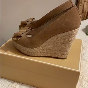 Used once. In great condition. One of my favorite pair of shoes I own. Summary spring shoes. Very comfortable. True to size. Khaki color suede wedges and comes in original box