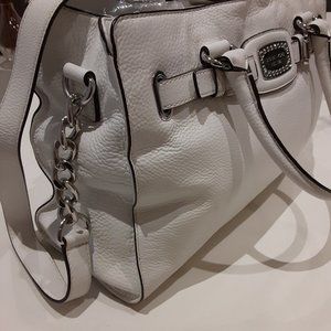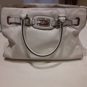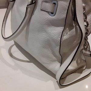 Authentic Michael Kors medium size bag with silver chain detail- very good condition - one small flaw on side- beautiful textured leather - 16" L x 12" W x 7" D - silver hardware - can be worn shoulder, crossbody or tote style - clean interior