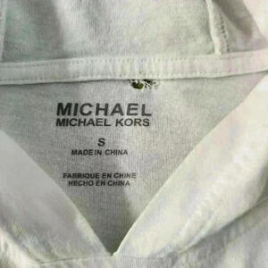 This lightweight, pull over, hoodie does have a small hole where the tag was. You can't see it when wearing, otherwise in great condition. it's white in color with a silver colored Michael Kors logo on front!