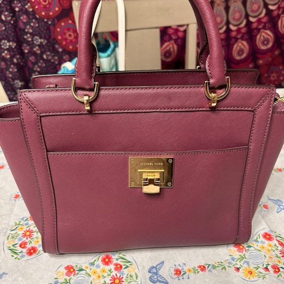 This elegant Michael Kors satchel in a rich purple hue features a structured design with gold-tone hardware, offering a blend of sophistication and practicality. Its medium size makes it ideal for daily use, seamlessly complementing both casual and professional attire.