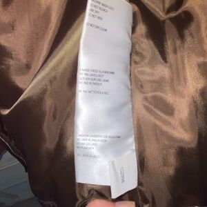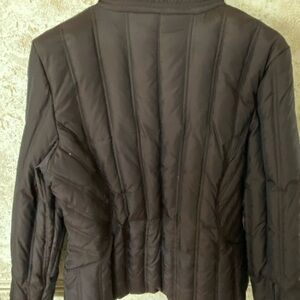 Beautiful winter brown jacket with leather detailing around front, pockets and sleeves, double zipper, two front pockets and zippers on sleeves
