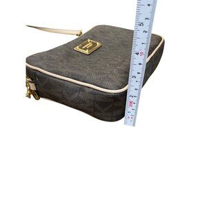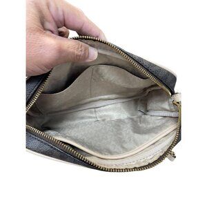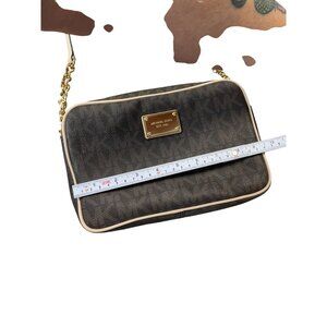 The Michael Kors Jet Set Crossbody bag combines elegance with functionality. Its iconic logo pattern and gold-tone hardware exude timeless style. Ideal for daily outings or evening events. The adjustable strap ensures a comfortable fit. In very good condition in and out with no defects noted. SKU 9224