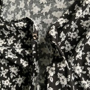 Black and white wrap top with snap to hold it closed . About 25 inches shoulder to hem . Pretty black and white flower pattern