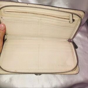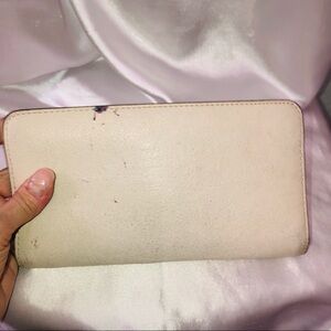 Michael Kors zip wallet Silvertone hardware off-white leather Wallet inside has 10 card slots one zip pocket for Bill receipt pocket has Small signs of wear and some ink marks on back priced accordingly
