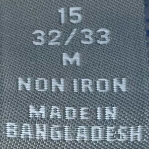 This non iron dress shirt has a mini print in medium blue on white. It has a wide regent style collar. In excellent used condition.