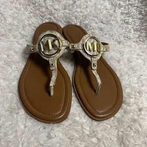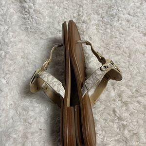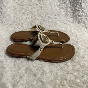 Michael Kors Aubrey Synthetic beige Thong Sandal gold tone logo accent SZ9.5M