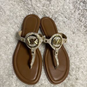 Questions? Leave a comment below! Michael Kors Aubrey Synthetic beige Thong Sandal gold tone logo accent SZ9.5M. Pre owned in good used condition signs of wear on the toe area strap has some wears see all pictures any questions please message. L4