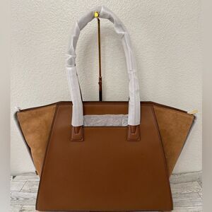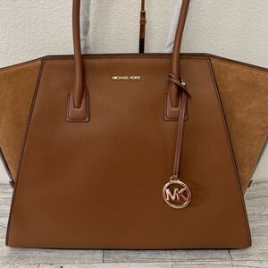 Michael Kors Avril Extra Large Tote New With Tag. Brown leather and suede with gold tone hardware, back slip pocket, zip top closure. Large spacious interior features side zippered pocket. Measures 12” tall, 15” wide at bottom, 20” wide at top with a 9” strap drop. Retail $628