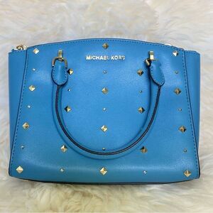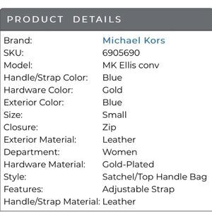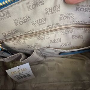 This gorgeous blue Michael Kors crossbody bag is so versitile, perfect for the bright spring and summer months! And the color pops. It’s new with tags. The strap is adjustable. It has gold hardware, open pockets and zip pocket inside.