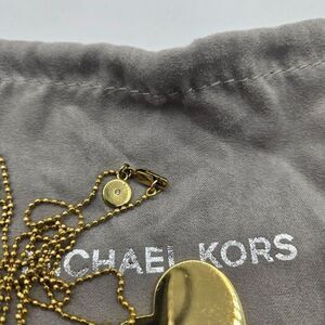 A sleek gold-tone heart pendant necklace by Michael Kors, featuring a signature design and paired with a drawstring dust bag for safekeeping.