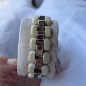 Stylish Michael Kors watch with a silver case and cream band. Features a chronograph dial. Worn, in great condition. No box.