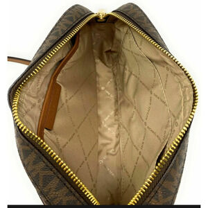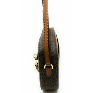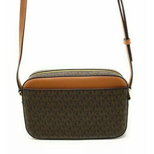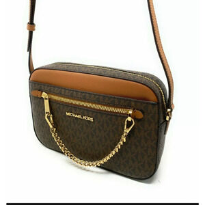 This Michael Kors Jet Set crossbody bag is a must-have for any fashion-forward woman. The handbag features a unique signature print and comes in a beautiful brown color. It has a zipper closure and a gold-plated hardware accent that adds a touch of elegance to the bag. The handbag has a small size, measuring 10 inches in width, 6 inches in height, and 2.5 inches in depth. It has a shoulder strap that can be adjusted to your liking and is made of canvas material.