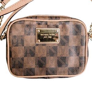 Michael Kors Neutral Brown Checked Signature Gold Accent Small Crossbody Bag in EXCELLENT condition! Some scratches on gold zipper pull and name plate and wear around edges. See photos for details. Measures 6.5x5 with a 24 inch handle drop.