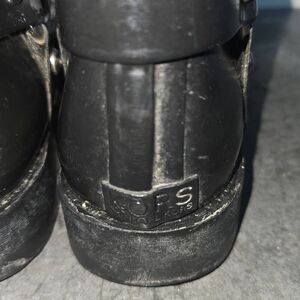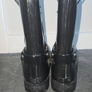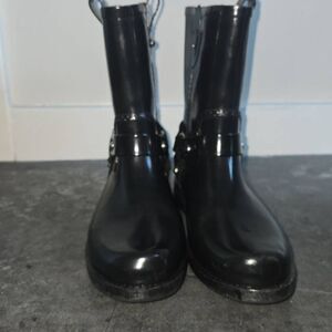 Michael Kors Ridley rain boots. These boots are characterized by their glossy finish, mid-calf height, and a decorative buckle strap around the ankle. The boots are made of rubber waterproof material, making them suitable for wet weather conditions. The design incorporates a rounded toe and a low heel.