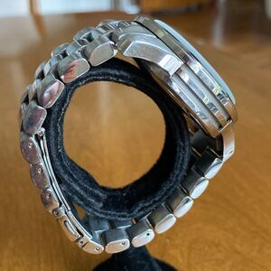 Stainless steel bracelet watch with tonal dial featuring three chronograph functions and date display between four and five o'clock.