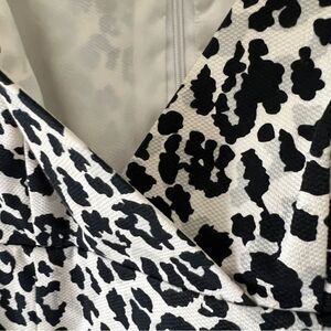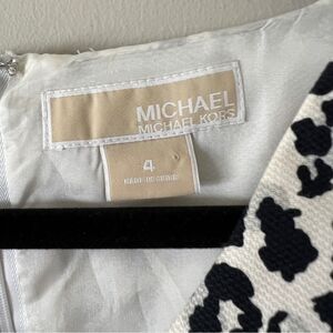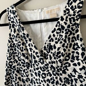 Michael Kors Sleeveless Textured Cross Front Animal Print Sheath Dress. Size 4. Black, white and gray in color. Back hidden zipper. Fully lined. Slightly stretchy. 97% cotton 3% spandex. Excellent used condition!