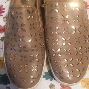 Experience the perfect blend of style and comfort with these Michael Kors sneakers. Crafted in a chic tan and gold color, they feature an elegant cut-out pattern and a sleek slip-on design. Ideal for casual outings, these sneakers offer a comfortable fit with a slightly padded opening and a flat white sole.