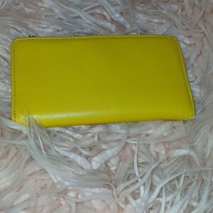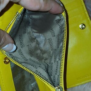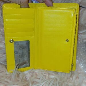 This vibrant yellow wallet from Michael Kors is crafted from smooth leather, featuring a sleek rectangular design and a striking silver nameplate. Its bold color and glossy finish make it a standout accessory for any occasion.