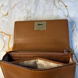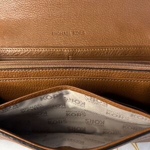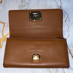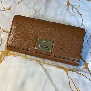 Michael Kors, beige, leather, large wallet 8 inches across by 5 inches with multi change slots and lots of card slots on both sides of the zipper inside.