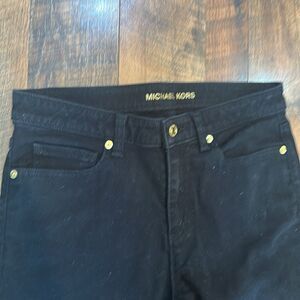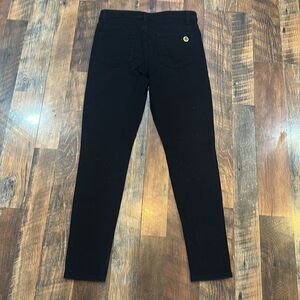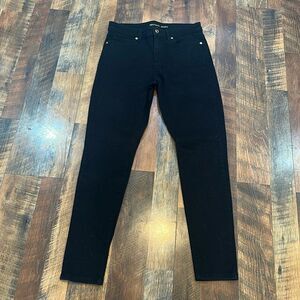 Black jeans in the Izzy skinny fit. All the hardware on these jeans are golden color. These measure 15 inches across the waist laying flat and have a rise of 9 inches. The inseam measures 29 inches.