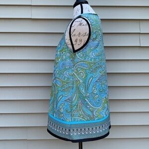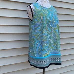 Lightweight tunic style sleeveless blouse with a 1/4 back zip. Paisley print in turquoise, green, white and black. Excellent like new condition. Silver toned hardware.