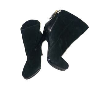 Michael Michael Kors 4 Inch Stiletto Heeled Black Suede Booties Gold Accent 9.5. Overall excellent preowned condition. Extremely gorgeous when work & comfortable because of the slight platform. Gold back buckle and gold name plate make this bootie that much more elegant. Please study all photos carefully to confirm condition, style & size.