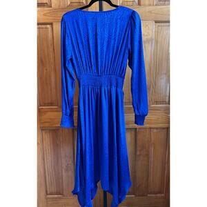 Brand new with tags Michael Michael Kors long-sleeve asymmetrical dress in a stunning cobalt blue with a subtle textured pattern. Crafted from a silky, fluid fabric that drapes beautifully. Flattering V-neck wrap-style bodice with smocked waist and cuffs. Handkerchief hemline adds movement and elegance. Perfect for special occasions or a sophisticated night out.