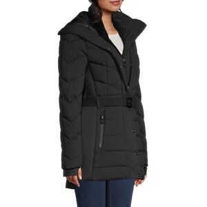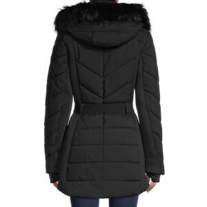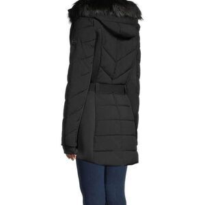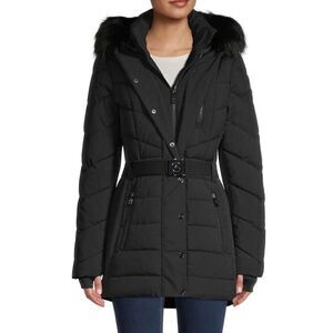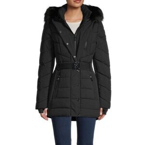 Michael Michael Kors Belted Puffer Faux Fur Trim Hooded Coat Jacket Black L