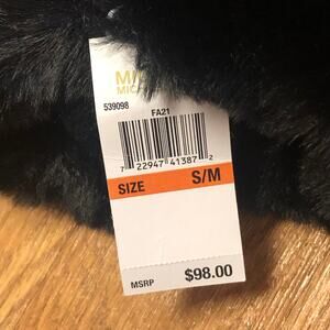 • Other information: Black quilted mittens with faux fur trim. Velcro and elastic near wrist area. Apparent rubber Michael Kors logo at top of mittens. Lightweight. Dry clean.