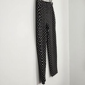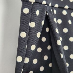 These Michael Michael Kors pants are size M with a 30-inch waist and feature a stylish black and white polka dot pattern. They are made of polyester and elastane, offering stretch for comfort. The pants have a pull-on closure, flat front design, and tapered legs with a 27-inch inseam. With a rise of 11 inches, these ankle-length pants are suitable for various occasions such as travel, parties, casual outings, or workwear, adding a touch of city-inspired style to your wardrobe.
