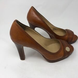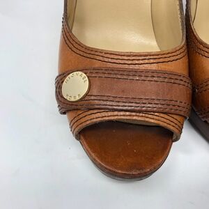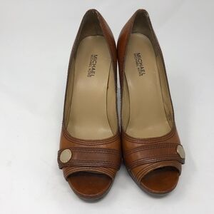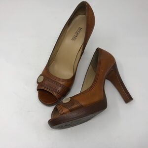 Michael Michael Kors brown leather peep toe pumps with circle logo charm on vamp. Size 10M. Gently used condition.