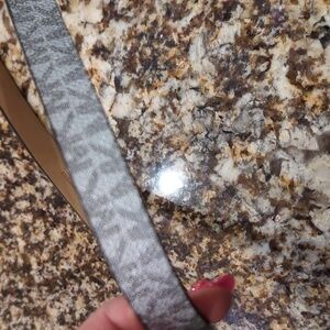 Stylish designer belt with monogram pattern. Features a sleek buckle. Perfect for any outfit.Michael Michael Kors Designer Monogram Belt in Silver Gray Women's Size Small