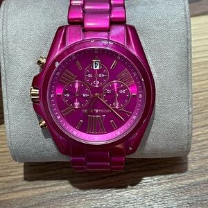 Elegant fuchsia watch with a glossy finish. Features a bold dial and metallic accents.