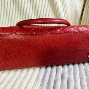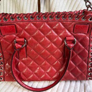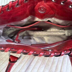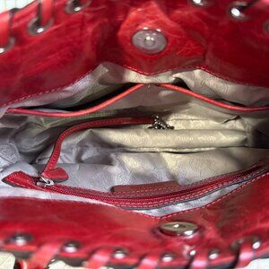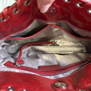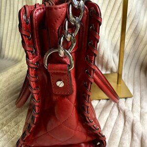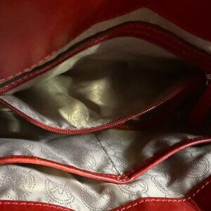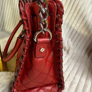 Hot! Hot! Hot! This fire engine red bag turns heads. With whip stitching around the edges and bold silver hardware she is ready for a night out. Lock and key included features one zipper pocket and two slip pockets inside. Feel free to ask any questions before bidding.