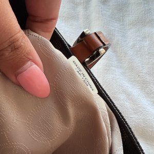Brown logo PVC with brown leather trim and gold accents. Water repellant coating