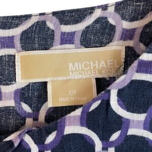 Michael Michael Kors Chain Link Linen Top. Size 10P. Navy, purple & white interlocking rings in 100% line. Crisscross bodice treatment with lower pleat. Back keyhole neckline with loop/button closure. Mid-back button treatment. Excellent Preowned Condition,