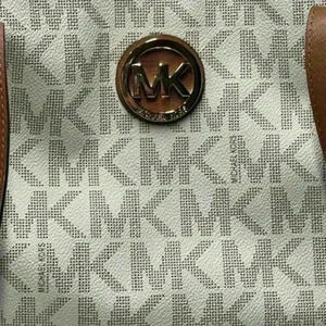MICHAEL Michael Kors Jet Set PVC MK Signature Tote Vanilla with brown leather trim. This bag was never used. The tags were removed (unfortunately) but it is brand new.