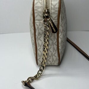 This is a beautiful Michael Michael Kors White Brown Logo Zip Camera Crossbody Bag. 9.5” x 6.5” x 2” with 25” adjustable strap. Clean logo satin interior with multiple compartments. No odors. No tears. No stains. Goldtone logo hardware.