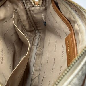 This is a beautiful Michael Michael Kors White Brown Logo Zip Camera Crossbody Bag. 9.5” x 6.5” x 2” with 25” adjustable strap. Clean logo satin interior with multiple compartments. No odors. No tears. No stains. Goldtone logo hardware.