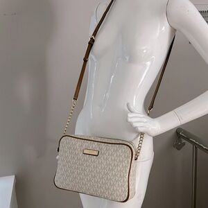 Michael Michael Kors Jet Set White Brown Logo Zip Camera Crossbody Bag